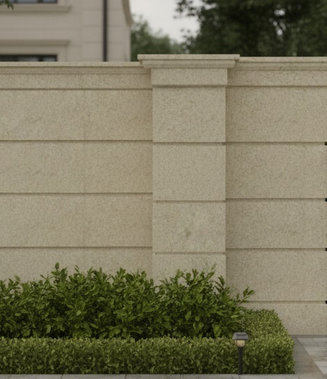 Element arhitectural tip capitel pentru partea de sus a stâlpilor de gard, realizate din piatră naturală gata tăiată și prelucrată în formă pentru a fi montată rapid și cu ușurință. Capitelul acoperă partea superioară a stâpului lat de gard din colecția GEORGIO.