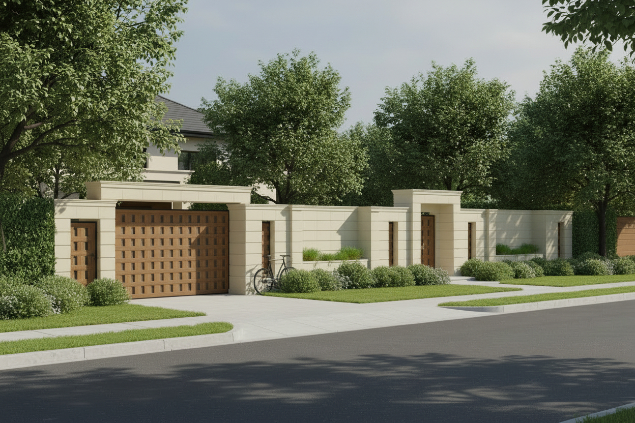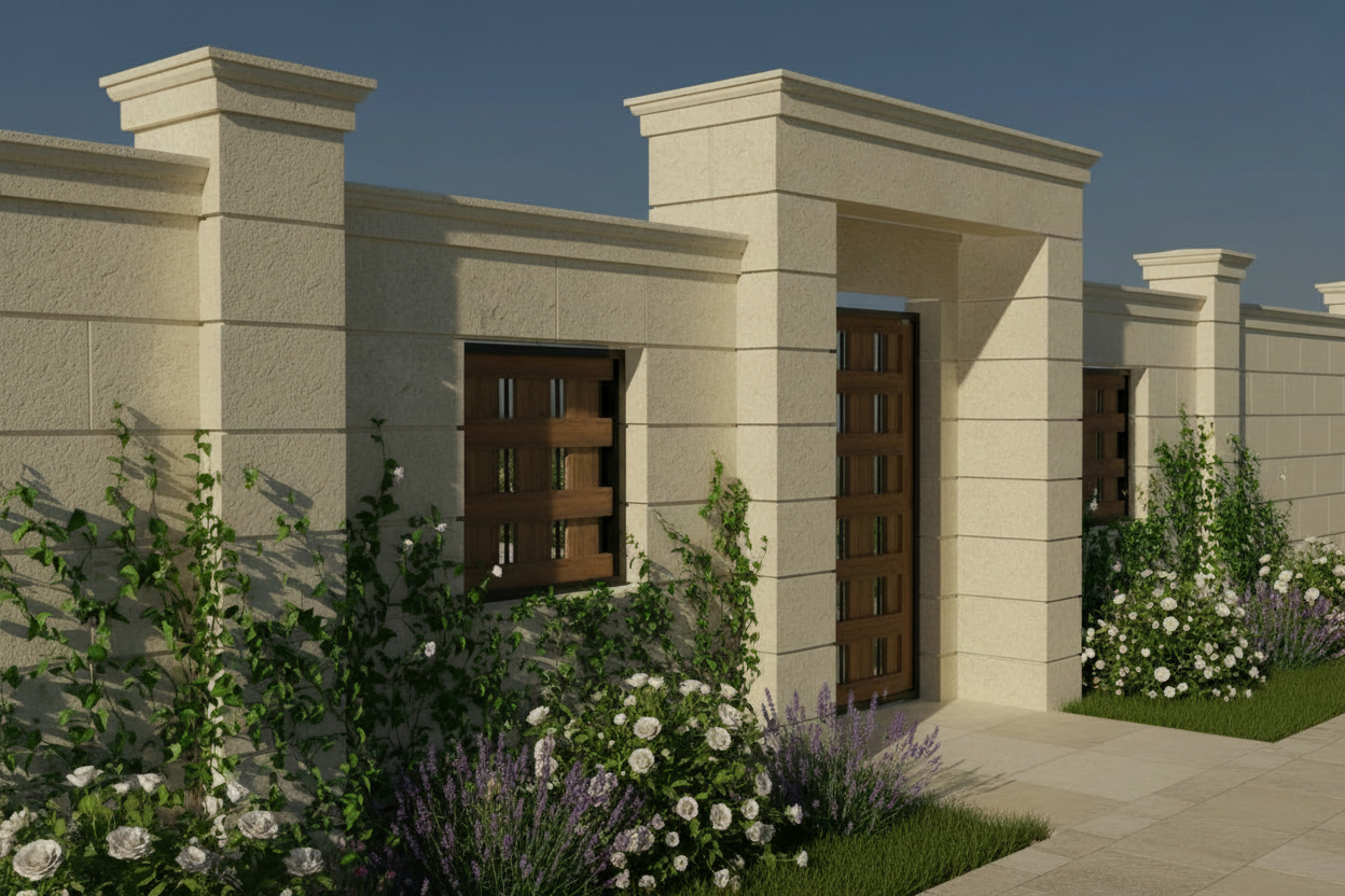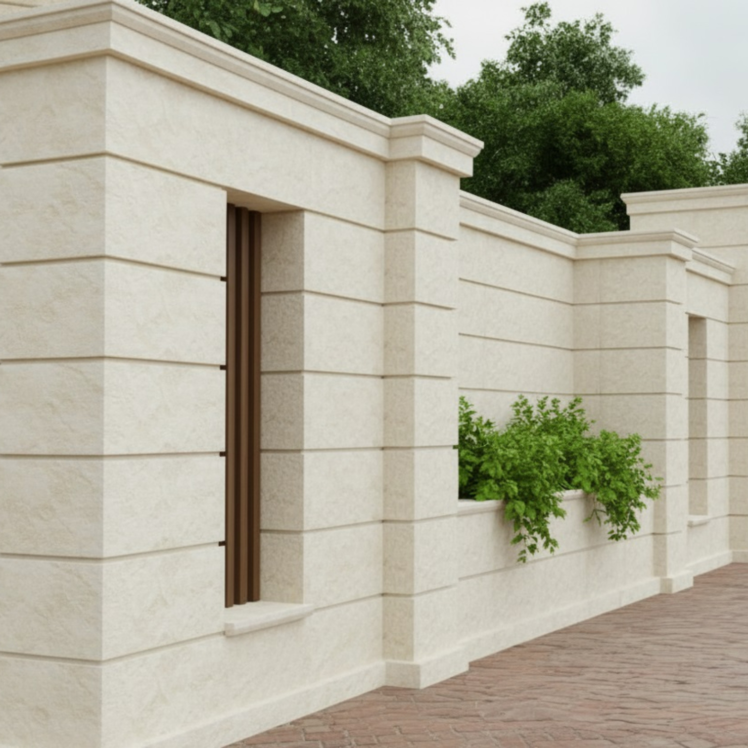 Elemente arhitecturale specifice pentru panou de gard cu nișă din colecția GEORGIO, realizate din piatră naturală. Ansamblul este compus din piese tăiate și prelucrate în formă pentru a fi montate rapid și cu ușurință. Panoul de gard acoperă una dintre fețele gardului, între doi stâlpi principali, lați.