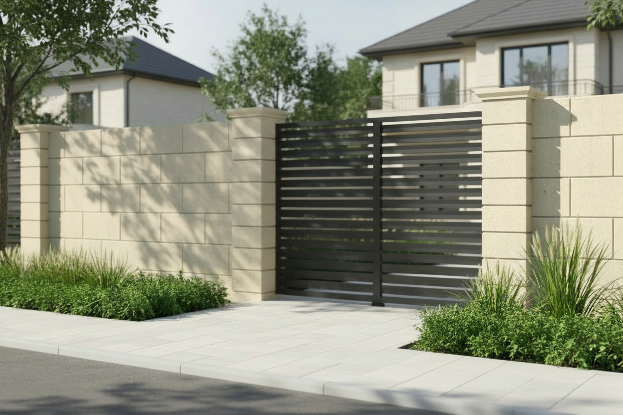 Elemente arhitecturale pentru panou de gard plin, din piatră naturală, compus din piese tăiate și prelucrate în formă pentru a fi montate rapid și cu ușurință. Panoul de gard acoperă una dintre fețele gardului, între doi stâlpi.