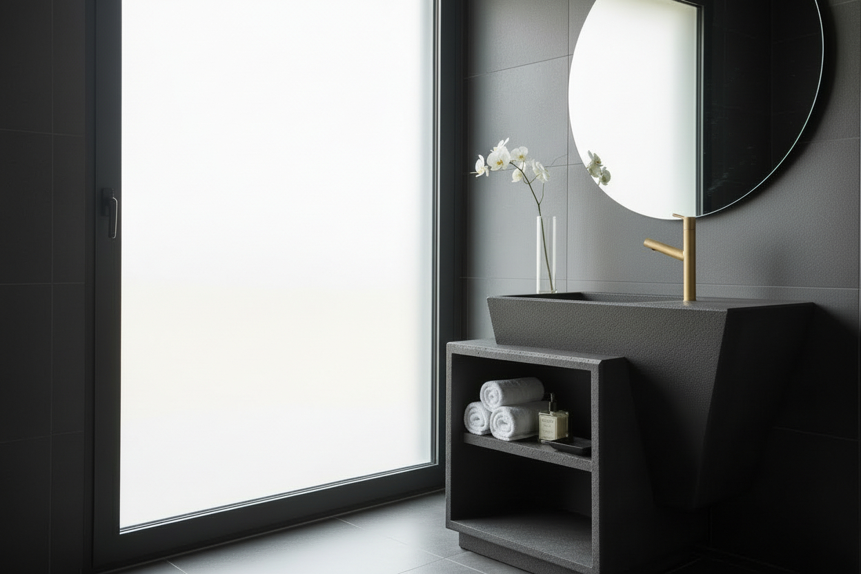 Lavoar modern cu rafturi, din granit Nero India cu suprafață impermeabilizată, periată, care nu lasă apa și mizeria să pătrundă în profunzimea materialului făcând-o astfel foarte ușor de întreținut.