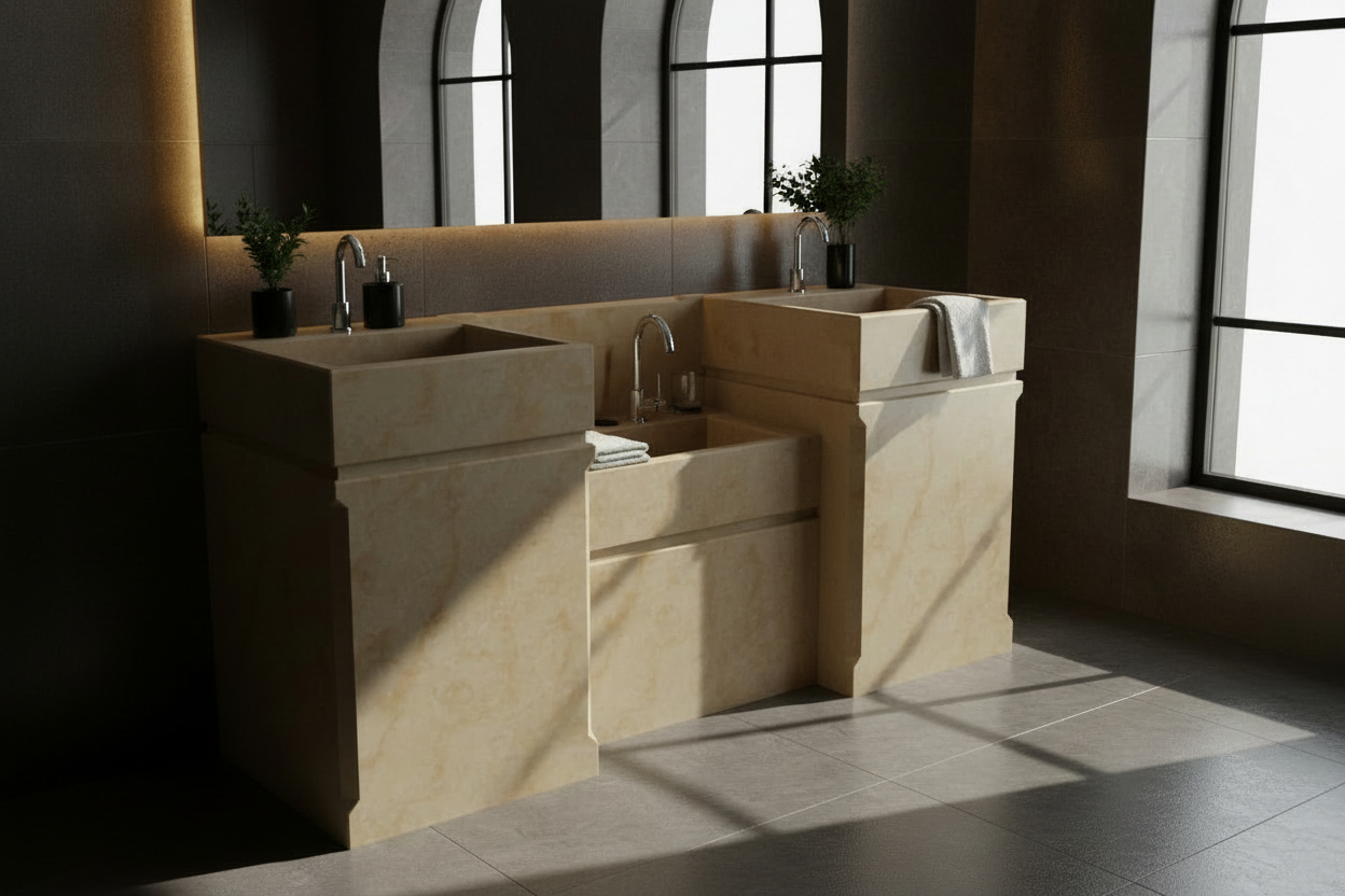 Chiuvetă de baie complexă din piatră naturală în stil clasic. Produsul cuprinde două chiuvete model Clarra și un lavoar conceput special pentru copii.